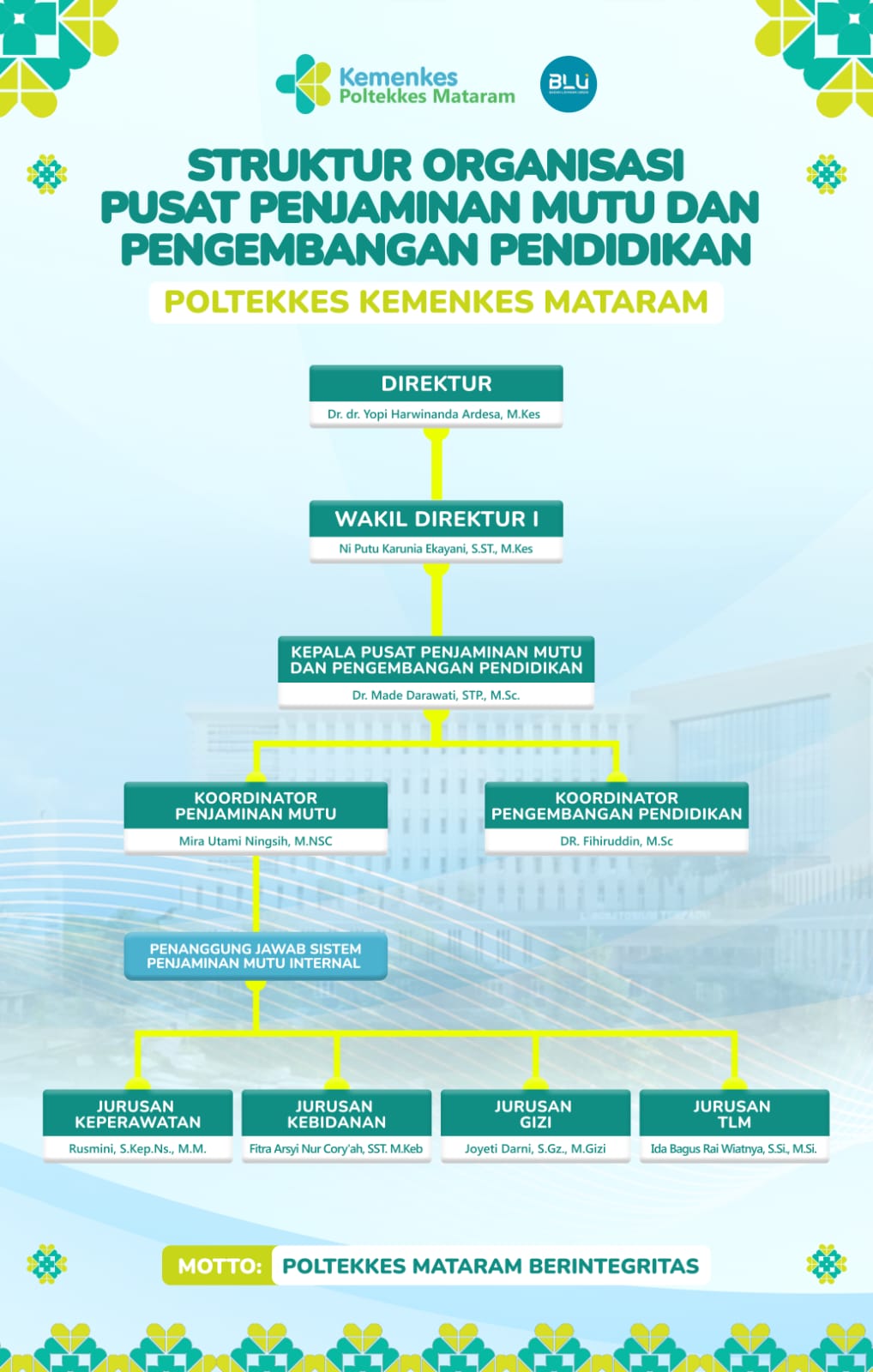 Sistem Penjaminan Mutu Internal (SPMI) Poltekkes Kemenkes Mataram merupakan pusat informasi dan dokumentasi resmi terkait pelaksanaan penjaminan mutu di lingkungan institusi. Melalui laman ini, Poltekkes Kemenkes Mataram menegaskan komitmennya untuk menyelenggarakan pendidikan tinggi kesehatan yang bermutu, akuntabel, dan berorientasi pada peningkatan berkelanjutan.